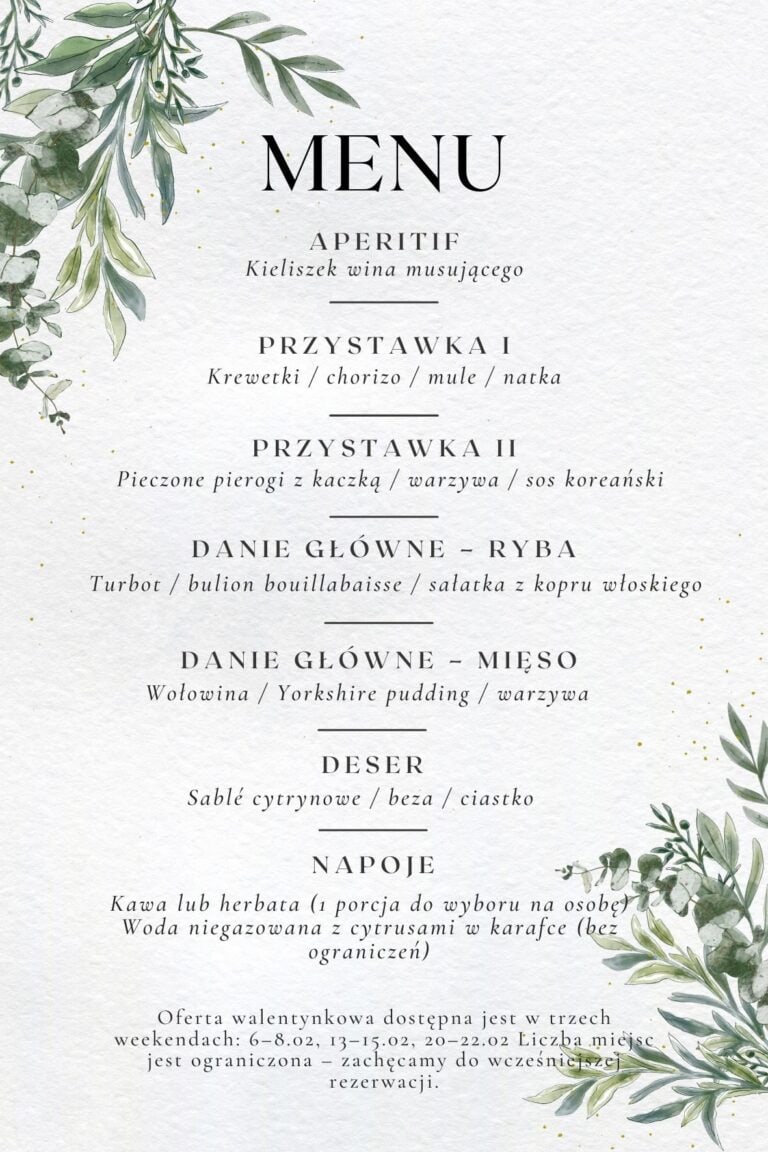 Menu degustacyjne obejmuje m.in. kieliszek wina musującego, dwie przystawki, danie główne (ryba lub mięso), deser, kawę lub herbatę oraz wodę z cytrusami bez limitu – wszystko podane w romantycznej oprawie, idealnej na walentynkowy wieczór.